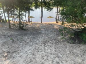Зона релаксации: Рядом расположен благоустроенный пляж с сосновым лесом, предоставляющий замечательную возможность отдохнуть на берегу водоема.