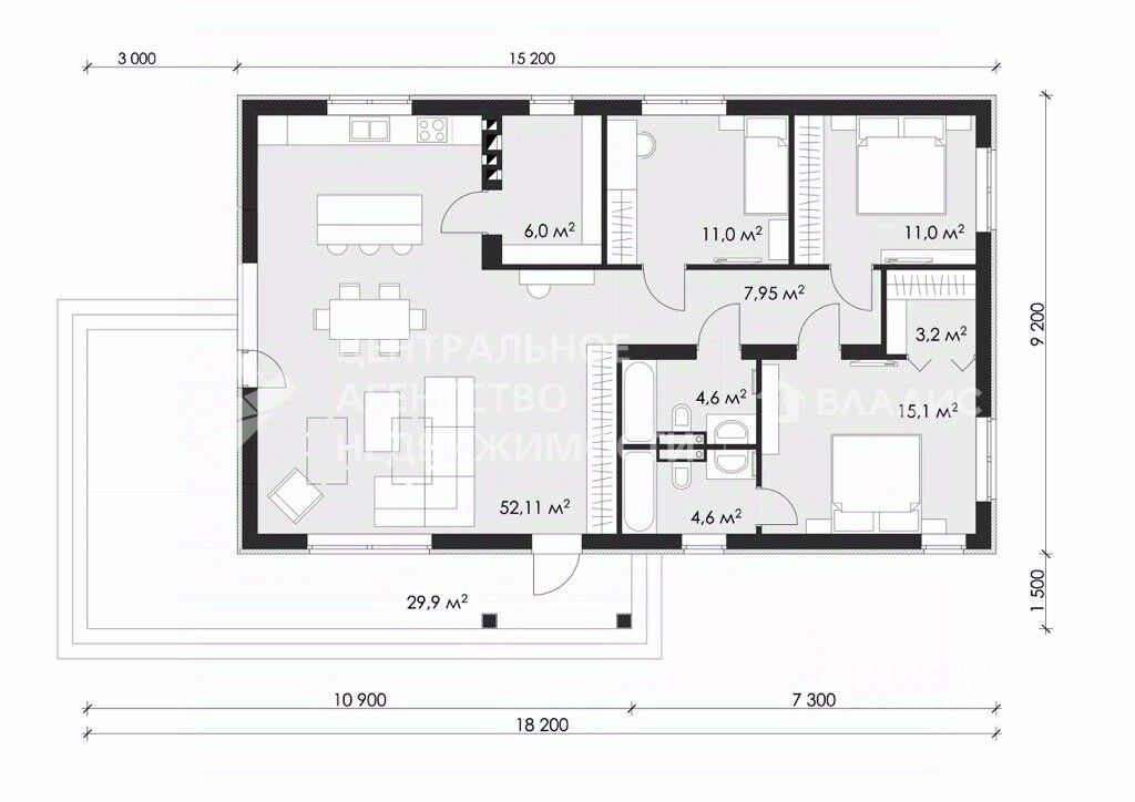 Дом: 15,2х9,2м; высота потолка: 3,16м.