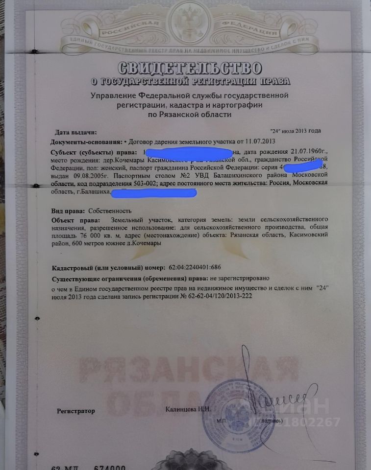 Земли сельхоз назначения, 80% земли заросло кустами и 34% деревьями. Земля находиться в 600м от деревни Кочемары, Касимовский район , рязанской области, рядом Окский заповедник, наичистейшая природа , для охоты все условия, река Ока в 5км от деревни. Любая информация пишите, звоните. Доки прилагаю.