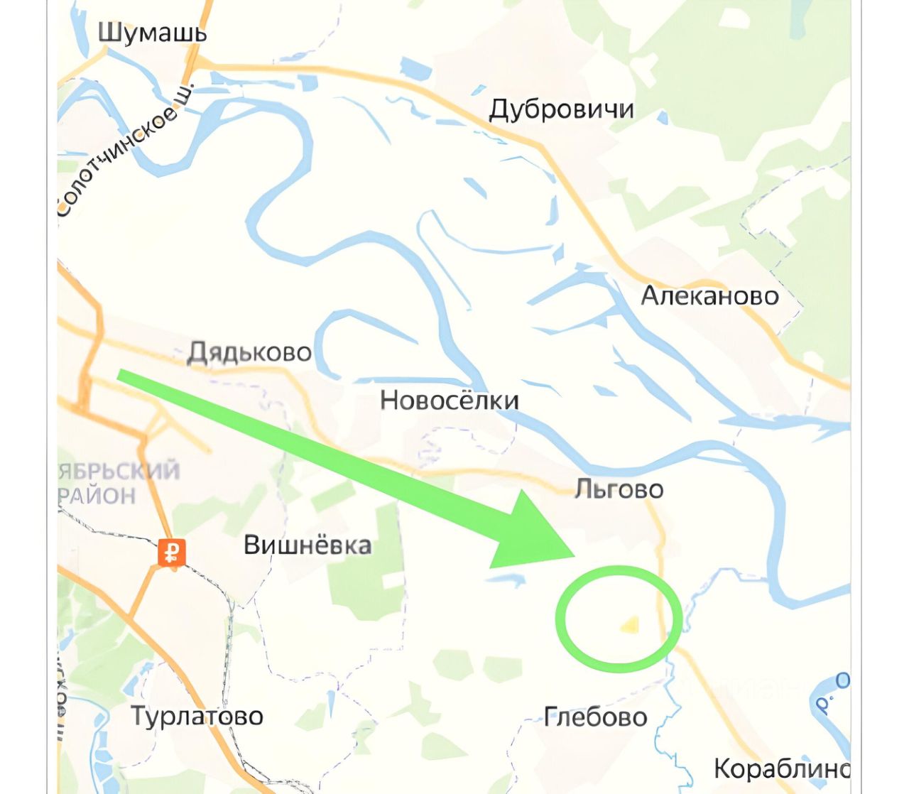 Район активно застраивается. Можно разбить на участки и продавать по отдельным участкам или приобрести под застройку коттеджного поселка.