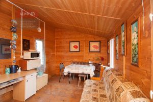 Сам дом из бруса, имеется мансарда, плюс каркасная пристройка, где располагается кухня и кладовая.