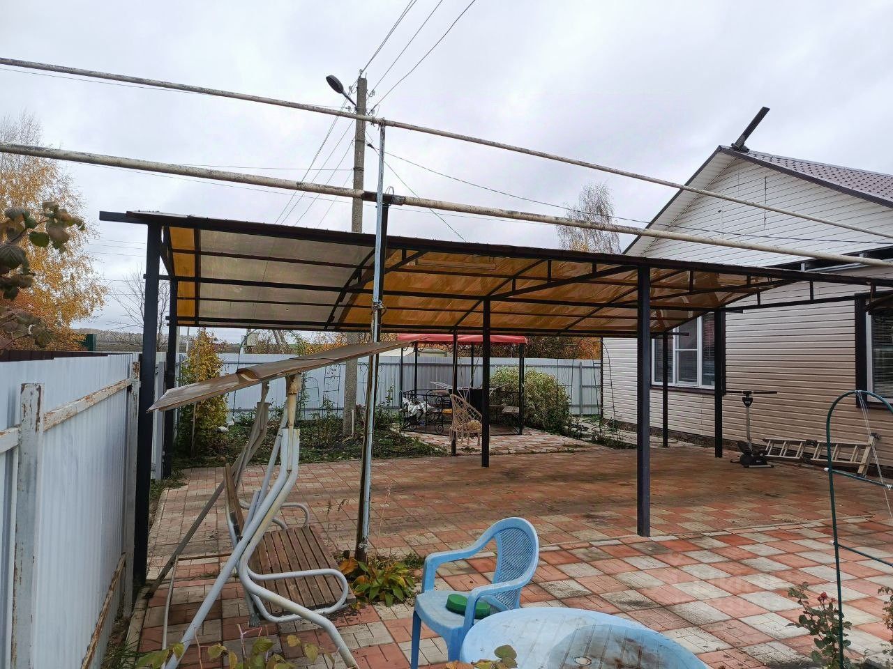 Просторный двор с крытым парковочным местом, новой беседкой и небольшим садиком. На участке есть место для построения гаража, бани, также есть теплица и место для огорода.