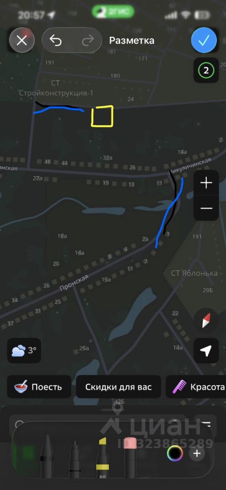 На фото с картой синим цветом показано место где нет асфальта, остальная дорога асфальт, желтым цветом обведено расположение участка.