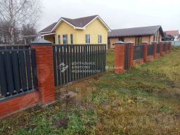 Участок квадратной формы, огорожен сеткой с трех сторон, с фасадной стороны кирпич/штакетник, въезд через откатные ворота. На участке кроме дома есть бытовка, временный туалет, беседка, колодец, земля плодородная, в этом году уже сажали огород.