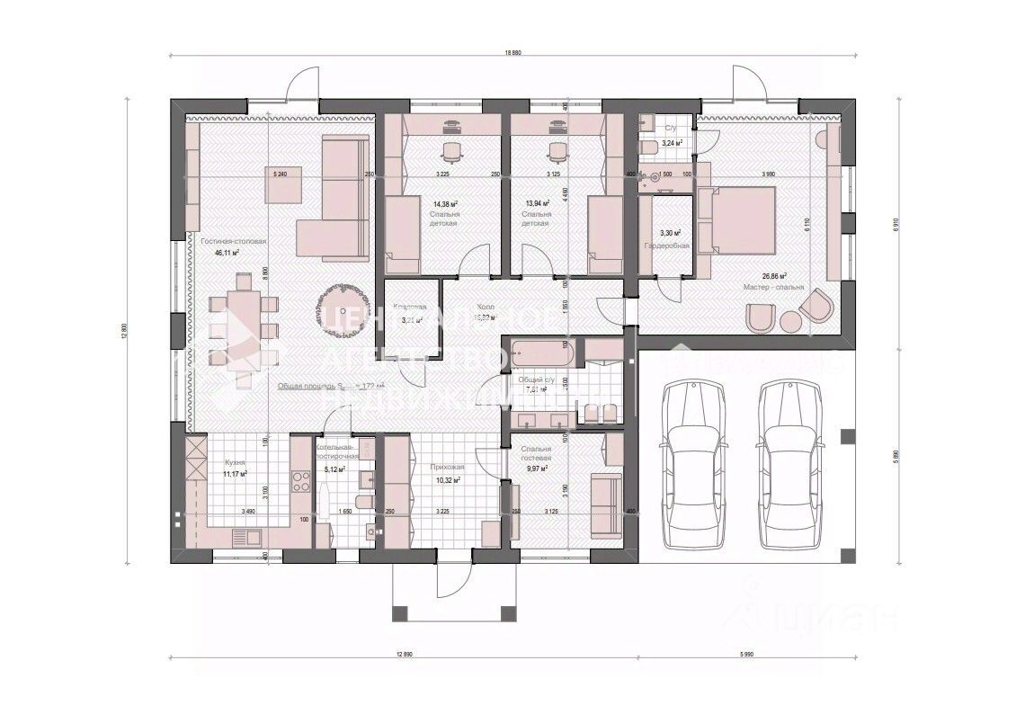 Мелко заглублённый ленточный фундамент 100 см, ниже нуля 80 см + выше нуля 20см. Кровля гибкая черепица Шинглас. 2 машиноместа под навесом