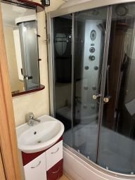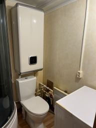 Санузел совмещенный, в доме. Установлена душевая кабинка, водонагреватель, стиральная машина.