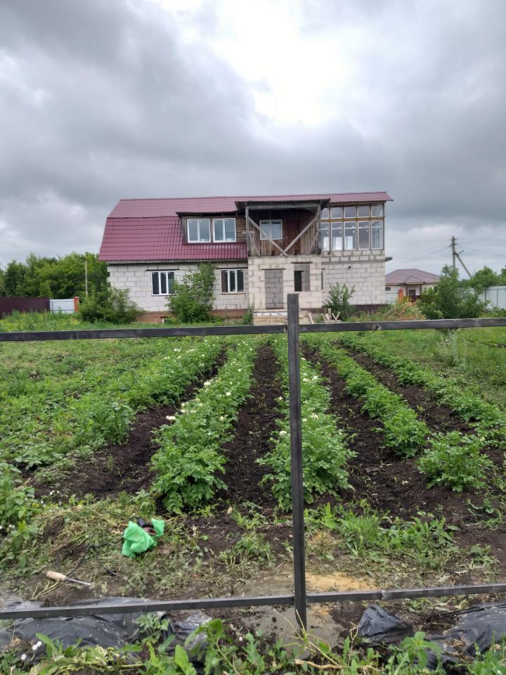 Большой пеноблочный дом, состоящий из двух домов на едином фундаменте. Большая входная группа с двумя входами в дом и выходом в сторону плодовых деревьев сада и для посадки в огороде.