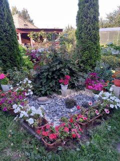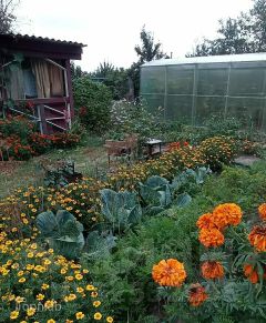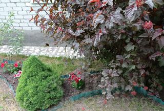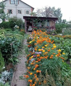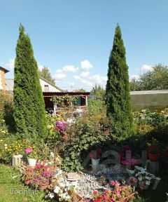 Участок представляет собой большой цветник с декоративными и плодово-ягодными насаждениями. Есть местечко и для огорода.