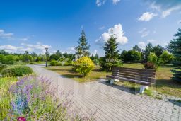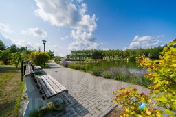 Благоустроенная территория поселка с озером и оборудованным пляжем только для жителей поселка, детский городок с мягким покрытием и спортивные площадки для взрослых.
