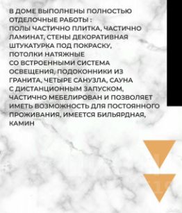 - в доме выполнены полностью отделочные работы: полы частично плитка, частично ламинат, стены декоративная штукатурка под покраску, потолки натяжные со встроенными система освещения, подоконники из гранита, четыре санузла, сауна с дистанционным запуском, частично мебелирован и позволяет иметь возможность для постоянного проживания, имеется бильярдная, камин;
