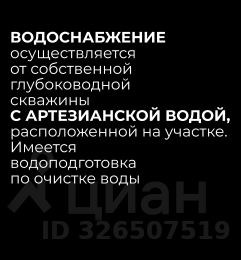 - водоснабжение осуществляется от собственной глубоководной скважины с артезианской водой, расположенной на участке. Имеется водоподготовка по очистке воды;