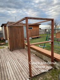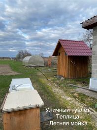 - двор под одной крышей с домом, площадью 60 м2, - гараж 5х7,5м, покрыт шифером, летний домик для отдыха 4,3х8м. В домике вода, газ, мойка, кровати, столы, стулья. Все для отдыха, - сарай для хозяйственного инвентаря 6х3 м., второй сарай для дров. Дрова используются для приготовления шашлыков, - летний туалет, - теплица с открывающимся верхом 6х3м, - летний душ с баком 200 литров с подогревом воды, - беседка радиусом 2,5 м., - качели. Соседи с обеих сторон отличные.