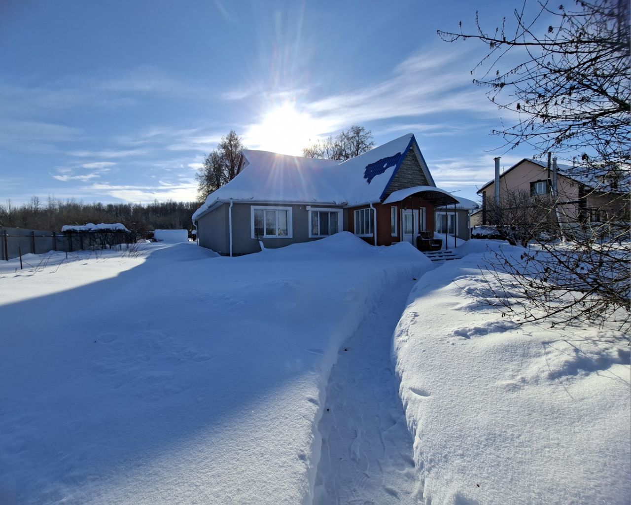 Прекрасный, красивый, просторный, теплый дом в живописном месте для большой дружной семьи! Полностью оснащен и обустроен! Большая гостинная с кухней и 4 спальни! 2 выхода: главный через закрытую террасу с прихожей-холлом и на участок с открытой террасой 30 кв м! TV + интернет во всех комнатах! Большой с/у с ванной!