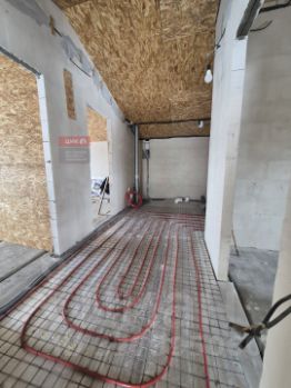 смонтировано отопление (теплые полы и радиаторы отопления по всему дому от газового котла), водоснабжение, канализация, разведена электропроводка.