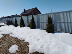 благоустройство: газонная трава на 6 сотках, по периметру внутри участка высажены 10 туй, а за участком высажены ели и сосны;