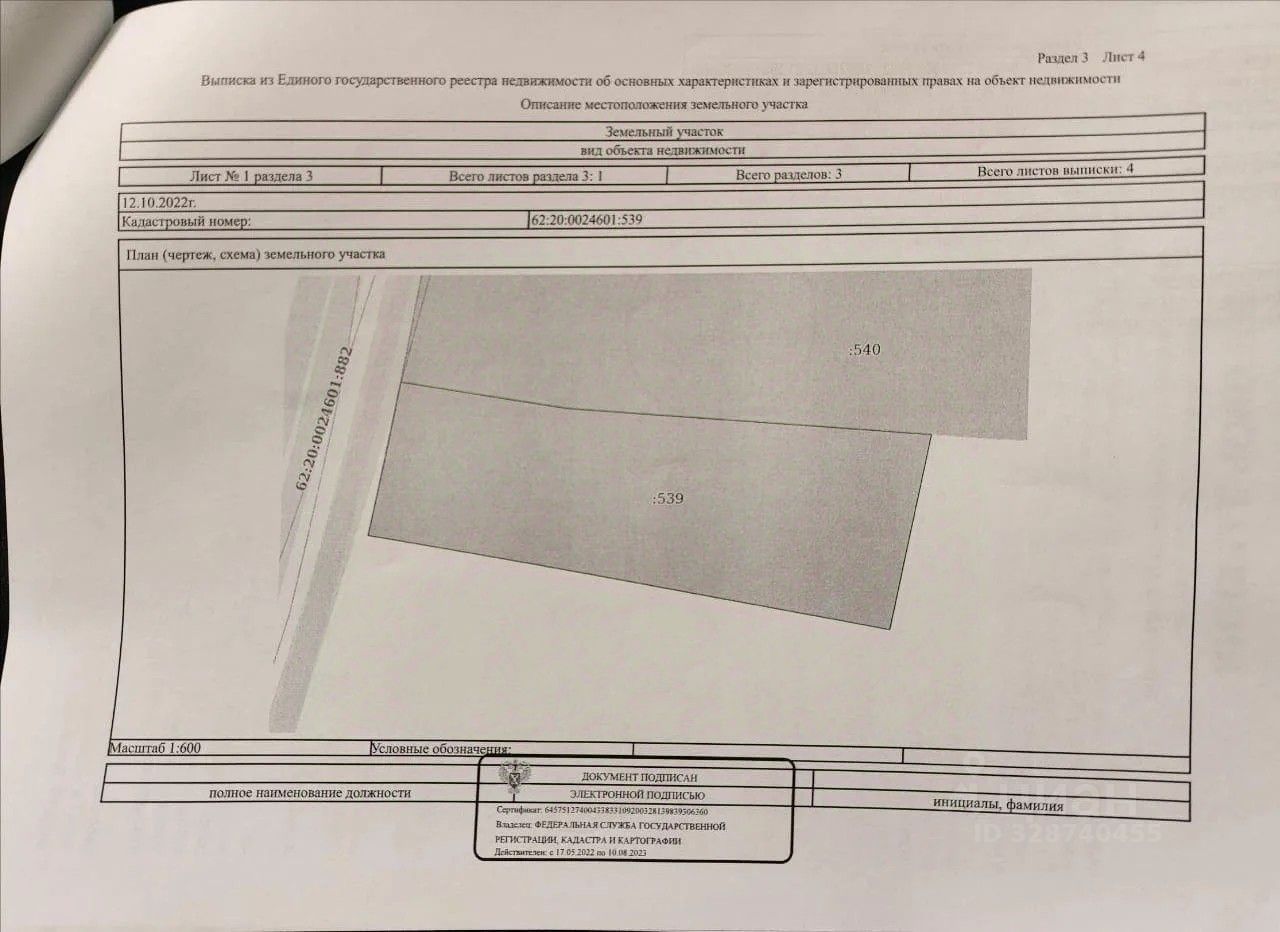 Продается земельный участок, кадастровый номер 62:20:0024601:539.