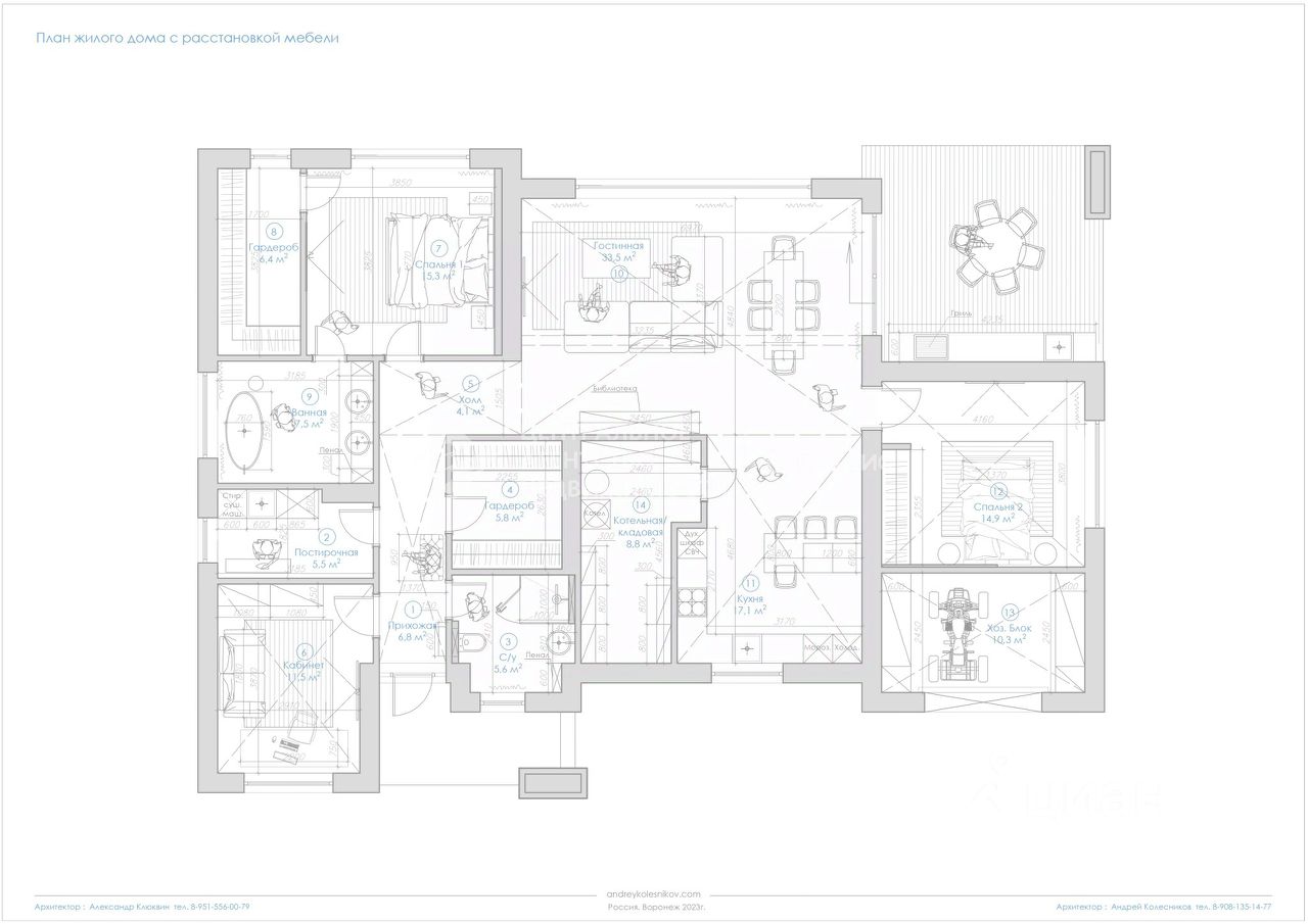 Современный архитектурный стиль и технологические решения. Проект архитектора Андрея Колесникова - члена союза архитекторов России. В доме по проекту 3 изолированные комнаты: 1 мастер спальня с гардеробной и с/у, 2 изолированные комнаты, гардеробная, постирочная, котельная /кладовая, кухня (17,1 кв.м) и просторная гостинная (33,5 кв.м).