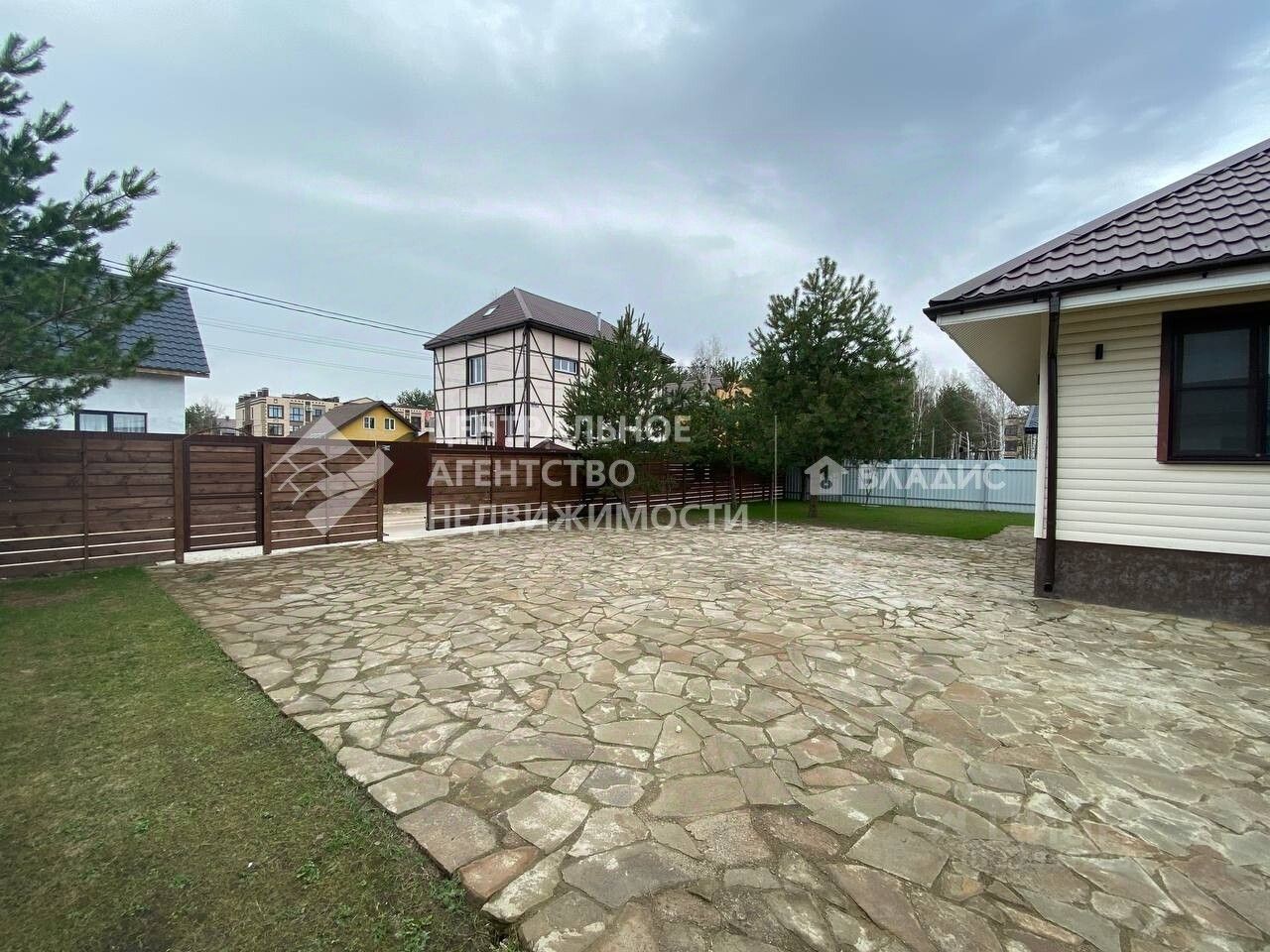 Сделано благоустройство участка, выложены декоративным камнем место для парковки и дорожки.