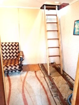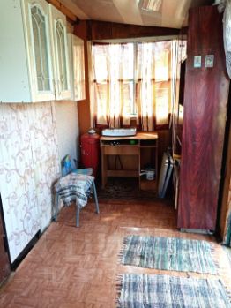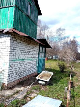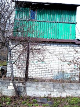 Домик небольшой, двухэтажный. Первый этаж кирпичный, второй деревянный. Крыша крыта рубероидом. В прошлом году перестелили деревянный пол в нижней комнате. В доме их две, одна на первом этаже, вторая на втором. Терраса служит кухней с газовой плитой, обеденным столом.