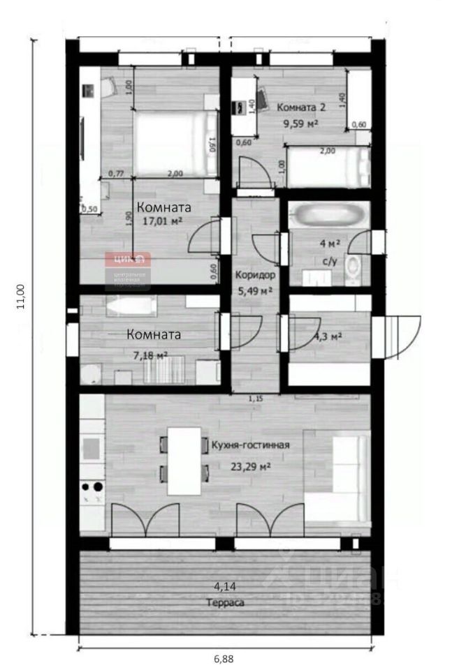 Удобная планировка включает в себя светлую гостиную, комфортные спальни и функциональную кухню, идеально подходящую для семейных вечеров.