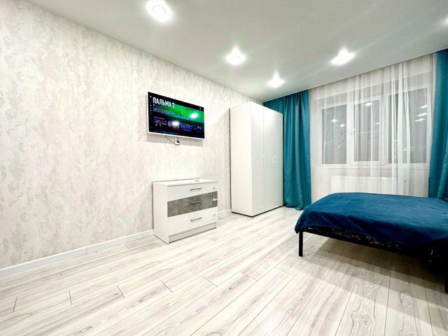 Спальня: кровать ,кондиционер , глянцевый шкаф-купэ, smart-телевизор, натяжной потолок с