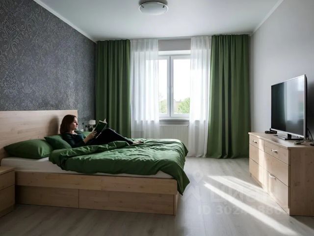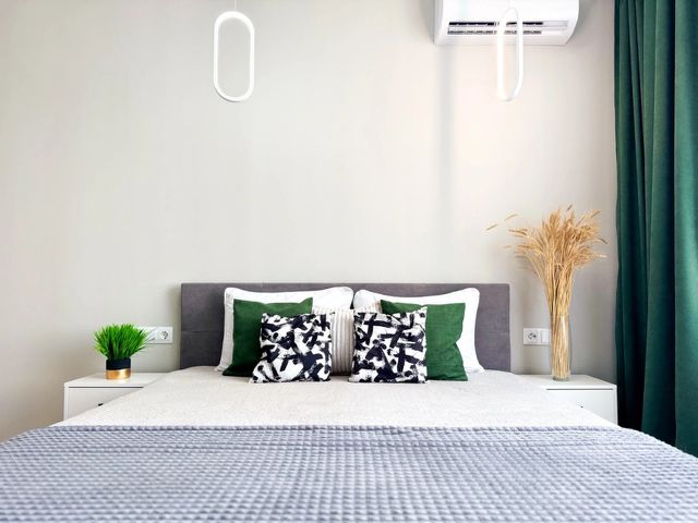 Спальня: кровать ,кондиционер , глянцевый шкаф-купэ, smart-телевизор, натяжной потолок с